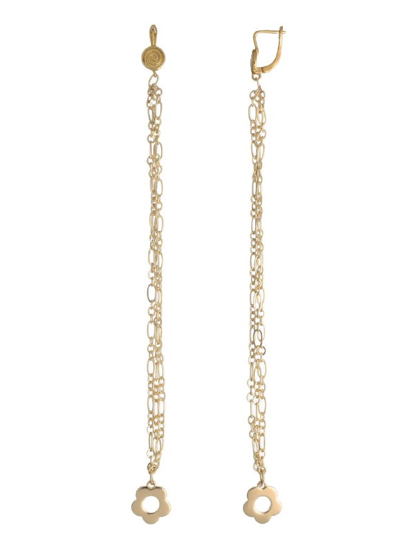 Double chain earrings asymmetric yellow gold with flower